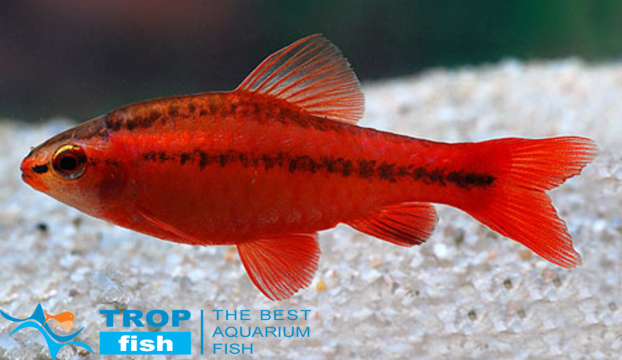 В длину барбус вишневый вырастает до 5 см.